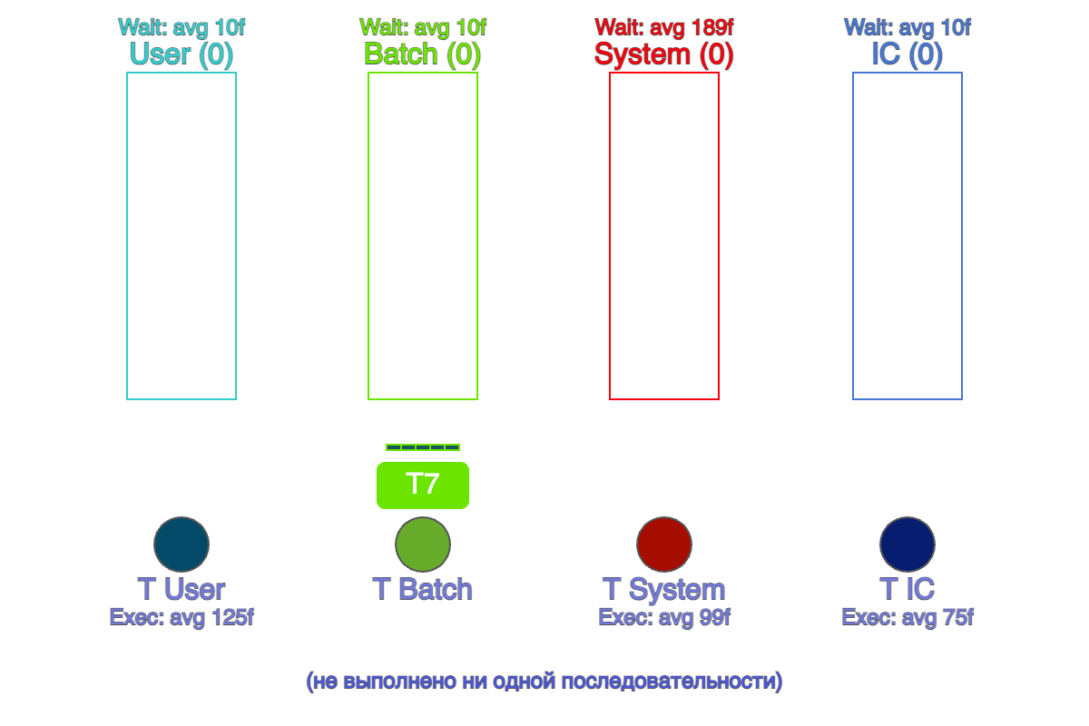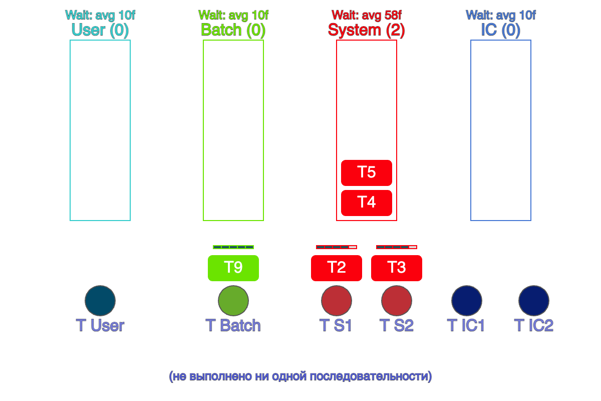 На ней изображены 4 очереди (User, Batch, System, IC) и 6 потоков, распределённых между пулами: 1 поток для User, 1 для Batch, 2 для System и 2 для IC.