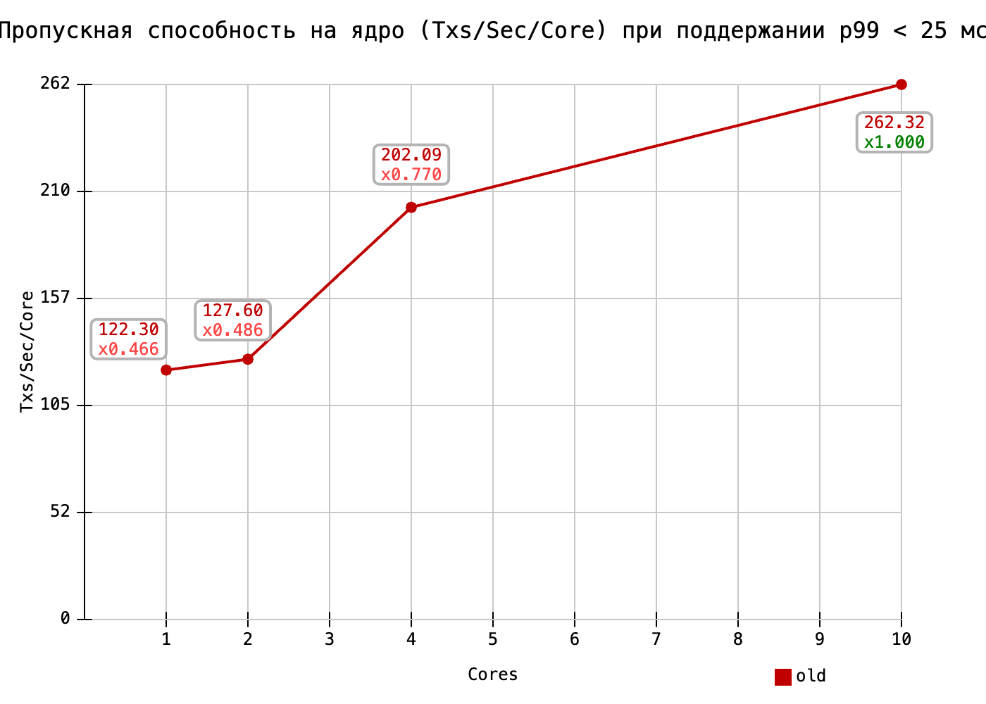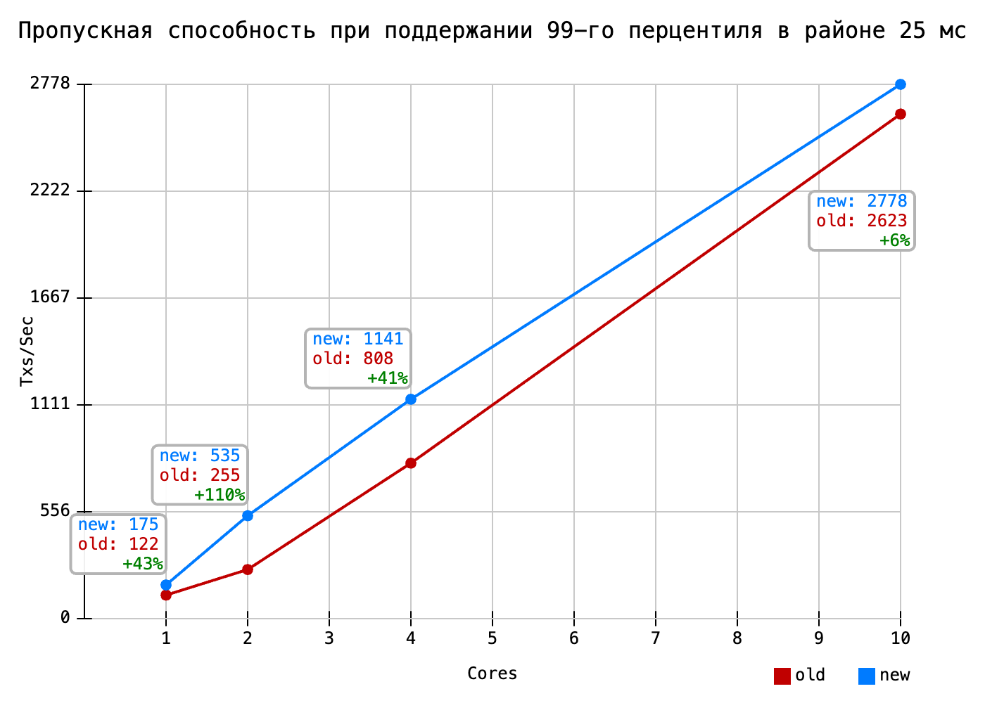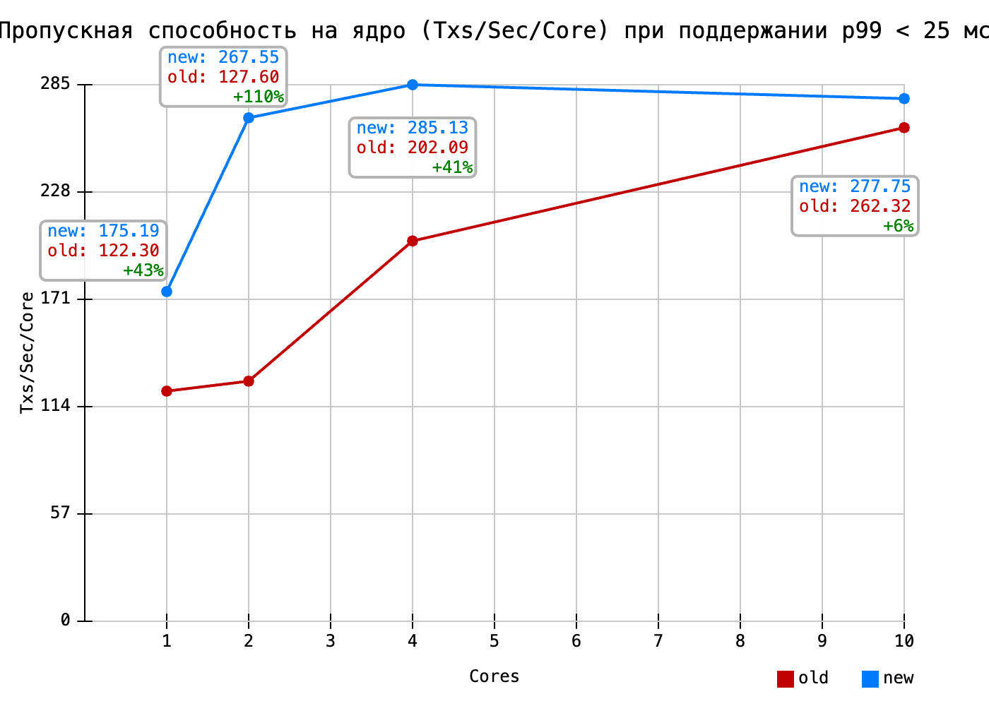 Именно здесь видны улучшения от внедрения общих потоков. Удельная производительность ядра в старой акторной системе стремительно падала по мере уменьшения числа ядер. При использовании общих потоков существенное падение удельной производительности наблюдается только на 1-о ядерной конфигурации.